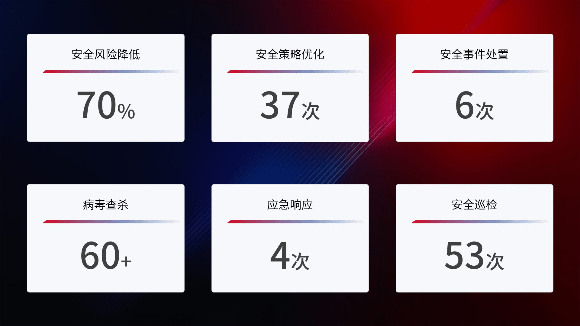 提供全面的安全事件报告体系,,包括处置报告、、周报、、季度和年度总结,,结合持续监控,,帮助客户深入了解网络安全状况。。。